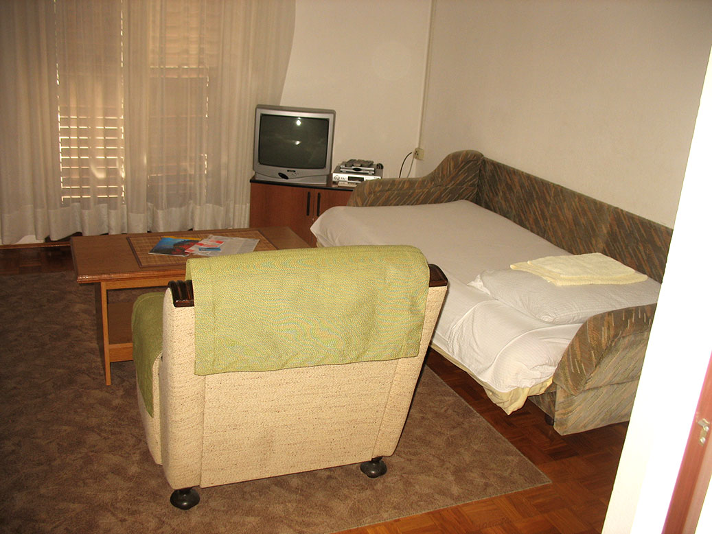 Przestronny salon połączony z kuchnią i balkonem stanowi idealne miejsce do wypoczynku. W apartamencie znajdziesz wszystko, czego potrzebujesz. Mieszkanie jest wyposażone w klimatyzację, TV, TV satelitarna, kuchenka, lodówka, naczynia i pościel. Składa się z sypialni dla 2 osób (łóżko małżeńskie), pokój dzienny z rozkładaną sofą dla 2 osób), kuchnia i łazienka. Istnieje możliwość dostawki na 5 osoby. |